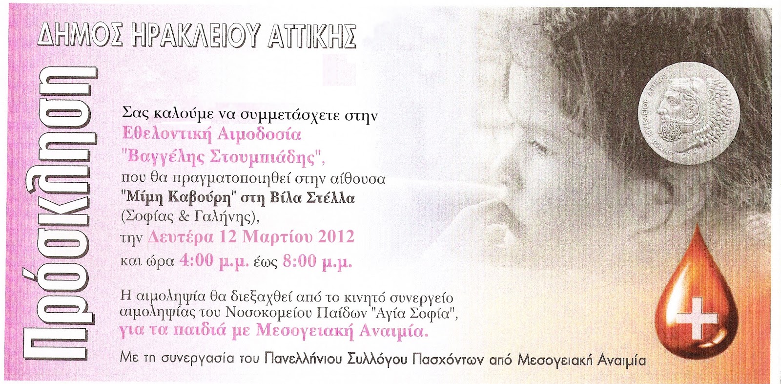 Αγαπητοί φίλοι και Συγγενείς της Αιμοδοσίας “Βαγγέλη Στουμπιάδη”, κρατώντας την υπόσχεση μας για την στήριξη και την βοήθεια των παιδιών με Μεσογειακή Αναιμία όπως κάθε χρόνο έτσι και φέτος διοργανώνεται η καθιερωμένη Αιμοδοσία σε συνεργασία με τον Δήμο Ηρακλείου και την υπηρεσία Κοινωνικής Πολιτικής, στην Αίθουσα της Βίλα Στέλλα στις 7 Ιουνίου, ξεκινώντας από το πρωί στης 8 πμ και μέχρι το απόγευμα στις 1,30,